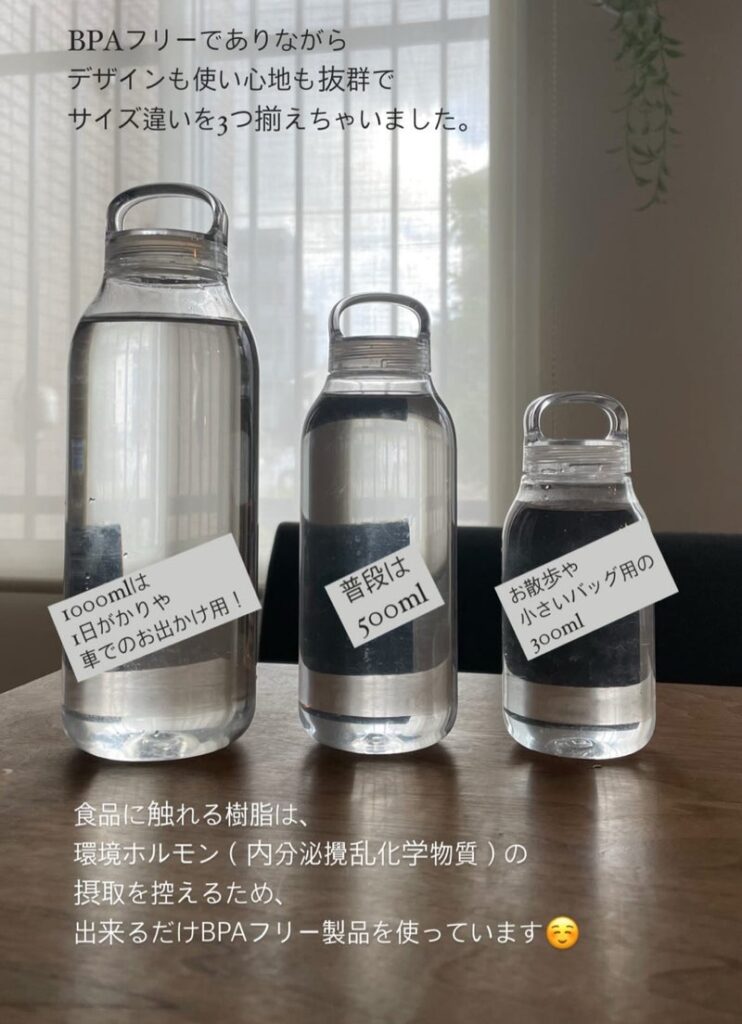 お散歩には小さいボトル、普段使いには中くらいの500ml、1日お出かけの日には1ℓサイズと、用途によって使い分け。お値段も手頃で、洗いやすく、デザイン性も高いのでとても気に入っています。容器の洗浄をしやすいのも長く使う上で重宝している点です。
